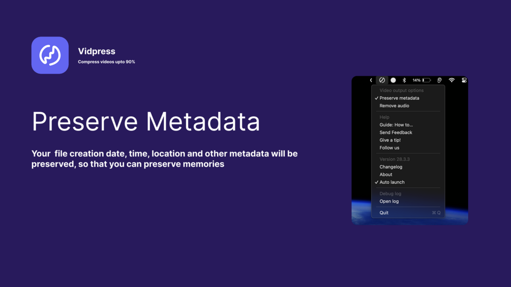 - Metadata Preservation: Choose to preserve metadata for your videos during compression.